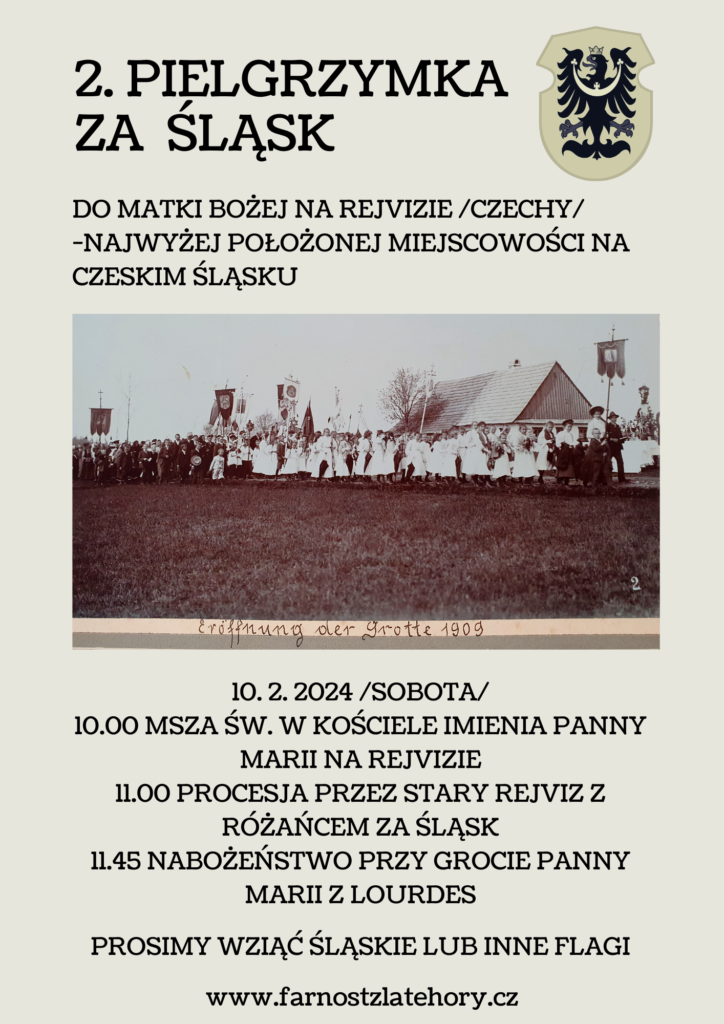 Serdecznie zapraszamy wszystkich Ślązaków oraz tych, którzy na Śląsku mieszkają i miłośników śląskiej historii, kultury i tradycji na Drugą Pielgrzymkę za Śląsk na Rejvíz koło Zlatých Hor w Republice Czeskiej. Rejvíz jest najwyżej położoną wsią na czeskim Śląsku i dlatego też z tego symbolicznego miejsca będziemy modlić się za naszą ukochaną historyczną ziemię podczas Mszy Świętej w sobotę 10 lutego 2024 w kościele pod wezwaniem Imienia Marii Panny, a następnie udamy się na pieszą procesję do jaskini Matki Bożej z Lourdes, która znajduje się na wysokości 790m. Z tego miejsca Najświętsza Maryja Panna spogląda na cały Śląsk i z tego miejsca wszystkim błogosławi.