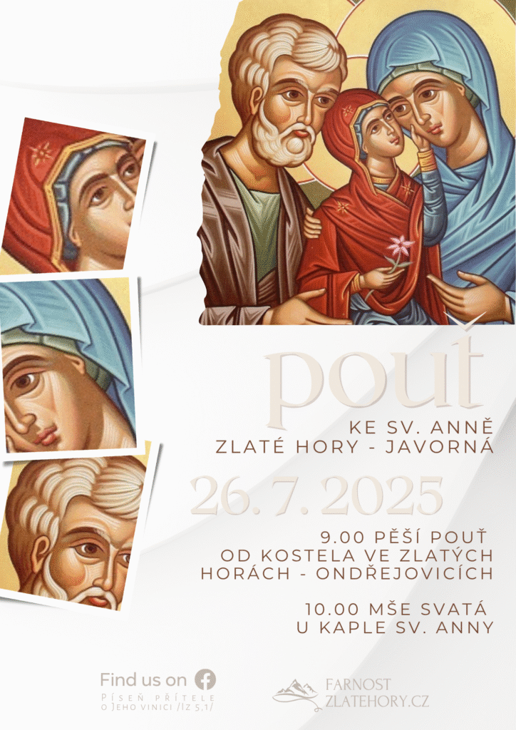 V sobotu – 26. 7. – srdečně zveme na pouť ke sv. Anně ve Zlatých Horách – Javorné. V 9.00 od kostela sv. Martina a Panny Marie Sedmibolestné ve Zlatých Horách – Ondřejovicích bude pěší pouť a pak v 10.00 mše svaté u kaple sv. Anny.