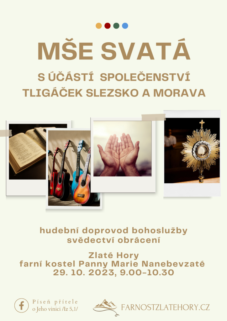 V nedělí 29. října prožijeme v 9.00 ve farním kostele Panny Marie Nanebevzaté bohoslužbu spolu se společenstvím cca 30 katolických věřících z Ostravy a okolí, kteří doprovodí bohoslužbu hudbou a zpěvem a po mši svaté se podělí svědectvím svého obrácení tj. svědectvím života s Ježíšem Kristem v katolické církvi. Na toto modlitební setkání zveme nejen věřící ale i ty, kteří hledají Boha ve svém životě. Všichni jste srdečně zváni na společné chvíle ve společenství v našem pěkném zlatohorském chrámě.