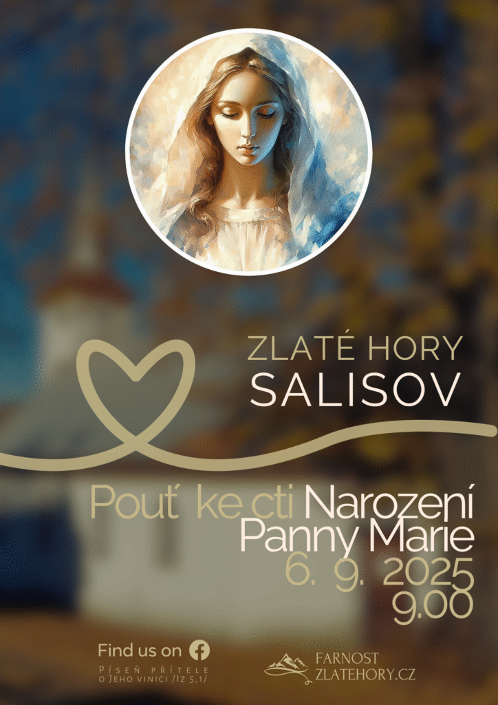 V sobotu – 6. září – zveme na poutní mši svatou do Zlatých Hor – Salisova, do kostela Narození Panny Marie. Bohoslužba začne v 9.00 s přímluvou za živé a zemřelé farníky, za všechny obyvatele našeho města Zlaté Hory, turisty a poutníky a stavitele chrámu. Oslavme svou účasti narození naši Matky, Panny Marie.