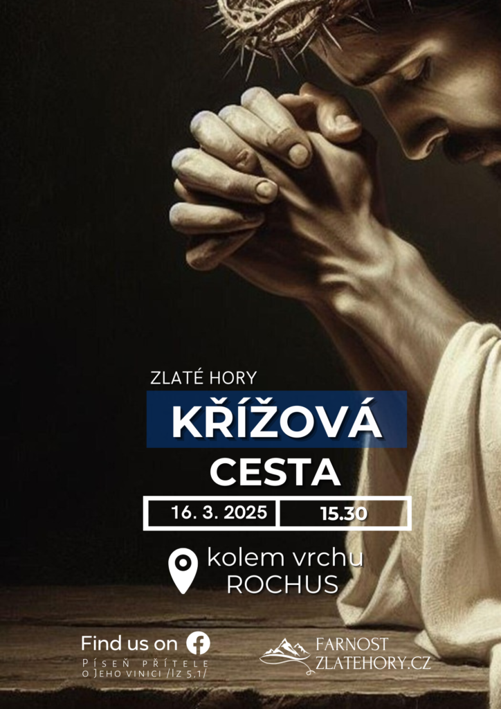 V postní době zveme na pobožnost křížových cest, které se budou konat v naši farnosti v kostele Panny Marie Nanebevzaté ve Zlatých Horách – Městě v pátky postní doby v 16.30 /po změně času v 17.30/. Křížové cesty ve Zlatých Horách – Ondřejovicích jsou každou nedělí v 7.00. Na velký pátek bude křížová cesta na Maria Hilf. Začátek je ve 21.00 u prvního zastavení /Bohema/.