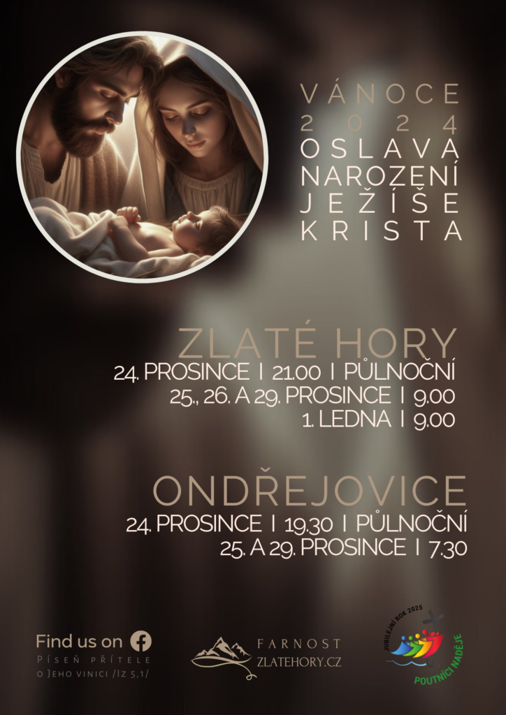Srdečně zveme občany Zlatých Hor a také všechny turisty a poutníky na vánoční bohoslužby do naších kostelů. Společně oslavme svátky narození Božího Syna Ježíše Krista. Děkujme za dar Jeho přítomností a vyprošujme si všechny dobré dary a milosti, které potřebujeme k pěknému životu, který má smysl.